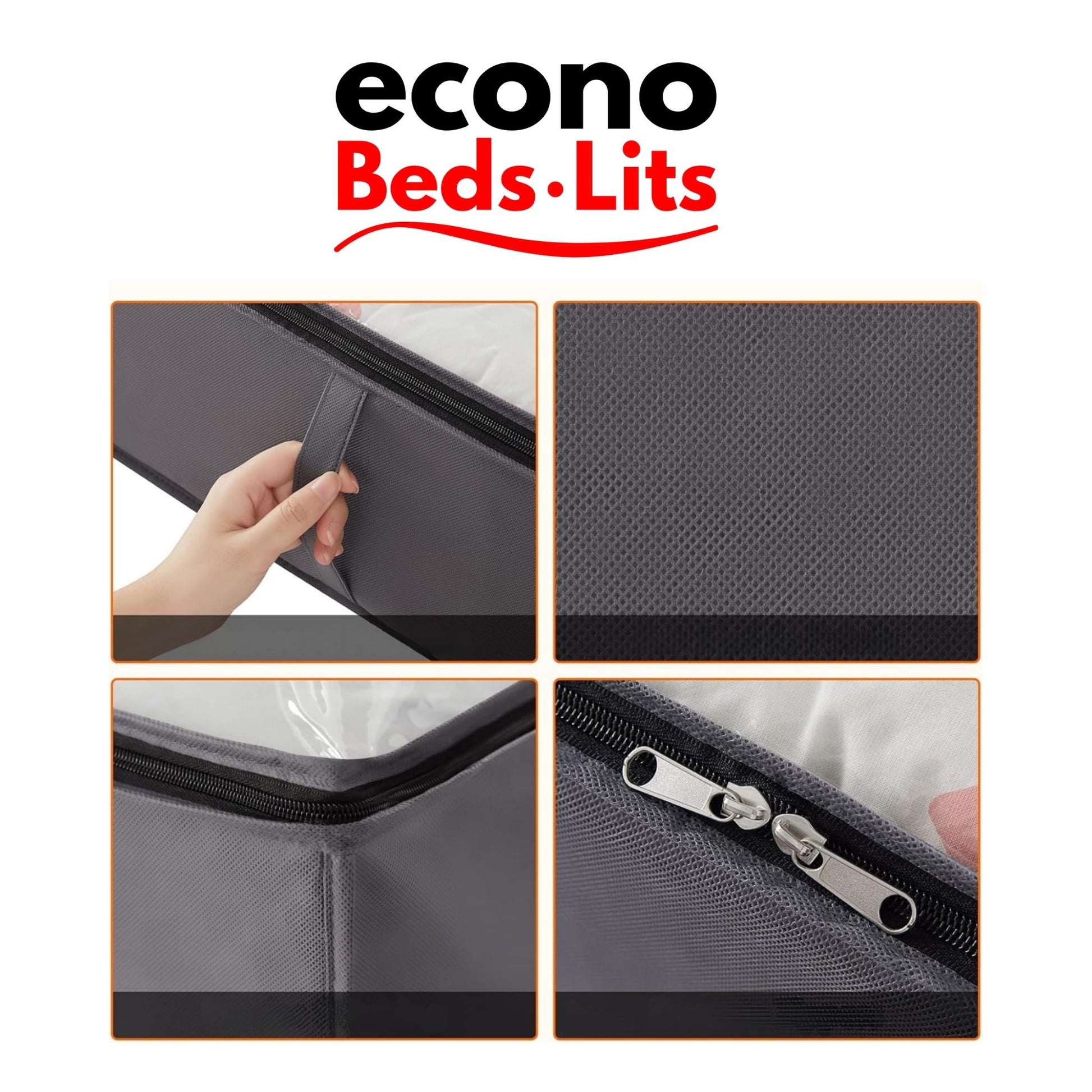 Poignées renforcées : Les 4 poignées renforcées, situées à l'avant et sur les côtés, permettent de tirer facilement le sac dans toutes les directions sous le lit. Elles sont conçues pour être robustes et résister à l’usure. Le bac se glisse facilement sous le lits.